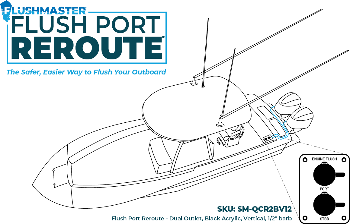 The Flush Port Reroute moves your engines’ OEM flush ports to a clean, accessible panel inside the boat. Just run a reinforced marine-grade hose through your existing rigging tube and connect directly to each engine’s flush port from inside the cowling.